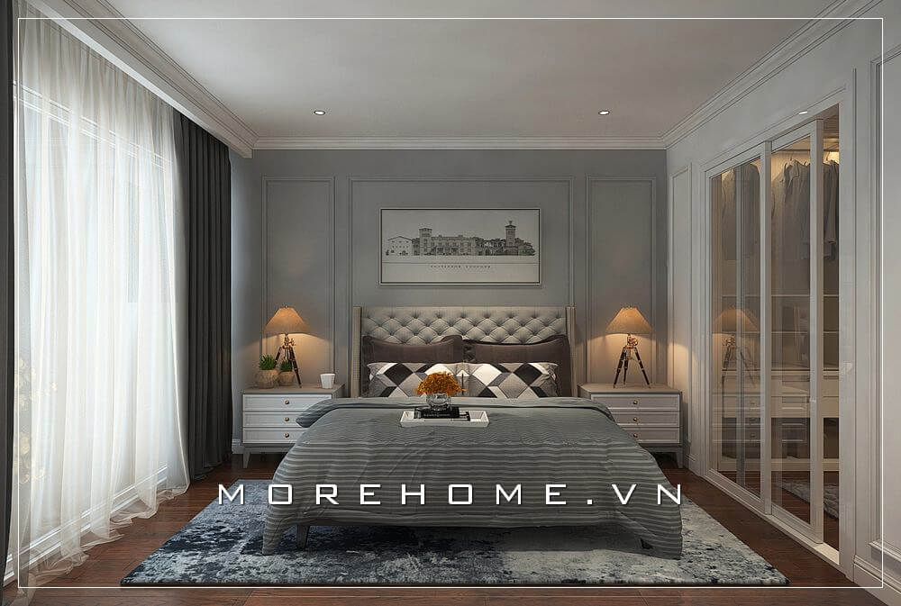 Giường ngủ biệt thự được thiết kế theo phong cách tân cổ điển, các đường nét chạm khắc không quá cầu kì, rối mắt đem đến sự sang trọng và tinh tế cho không gian căn phòng
