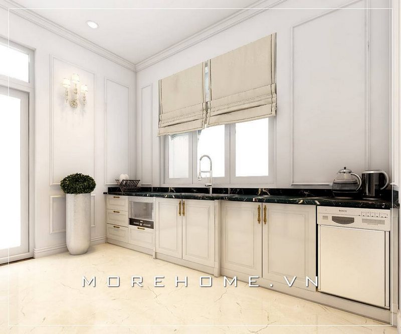 Mẫu tủ bếp gỗ tự nhiên được thiết kế tân cổ điển màu trắng sang trọng tạo không gian phòng bếp rộng và tiện nghi