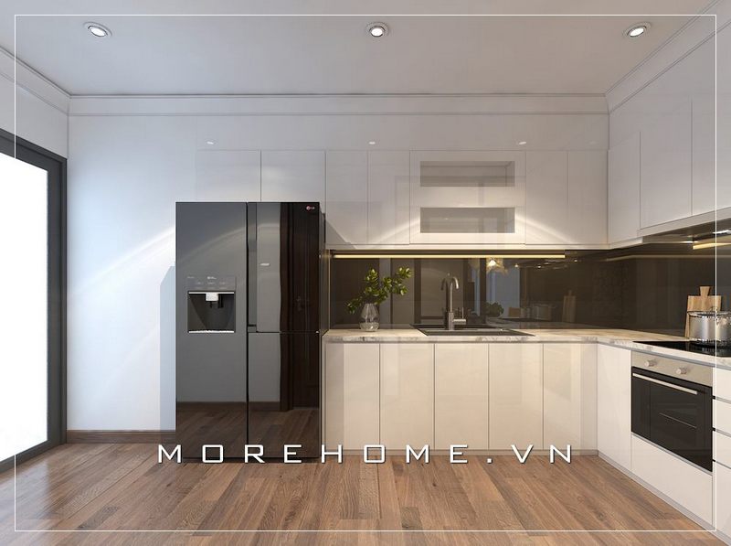 Thiết kế 3D mẫu tủ bếp chung cư bằng gỗ công nghiệp acrylic bóng gương màu trắng kết hợp gỗ Veneer màu vân gỗ đầy ấn tượng