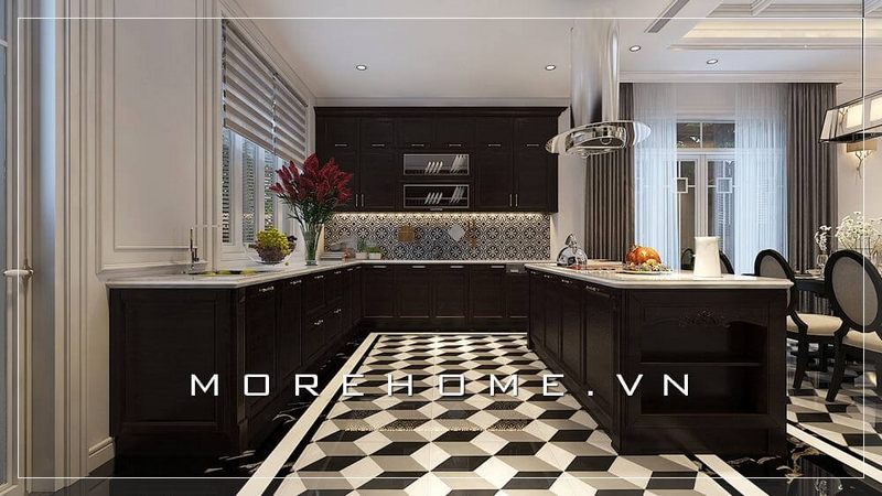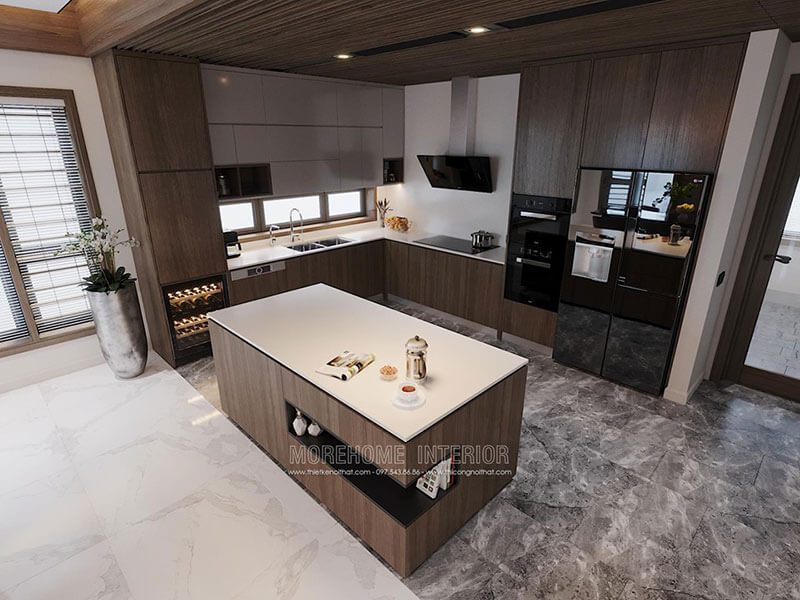 Tủ bếp chữ L gỗ tự nhiên được thiết kế một cách linh hoạt và khéo léo, kết hợp bàn bàn đảo được đặt ở chính giữa tạo sự bề thế, sang trọng cũng như đẳng cấp của chủ nhân ngôi nhà