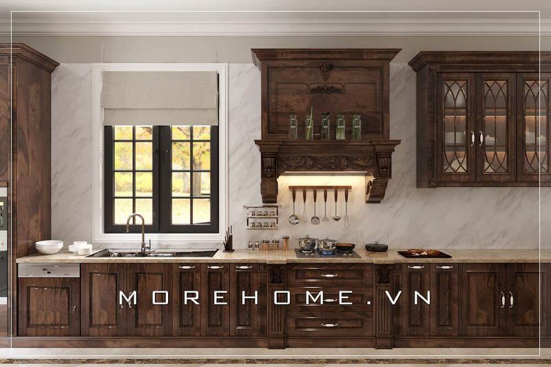 Mẫu tủ bếp gỗ tự nhiên chữ I tân cổ điển, mặt tủ bếp ốp đá màu vàng cao cấp giúp không gian nấu nướng của người nội trợ sạch sẽ, hứng thú hơn để tạo ra bữa cơm ngon cho gia đình.