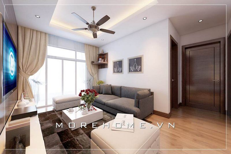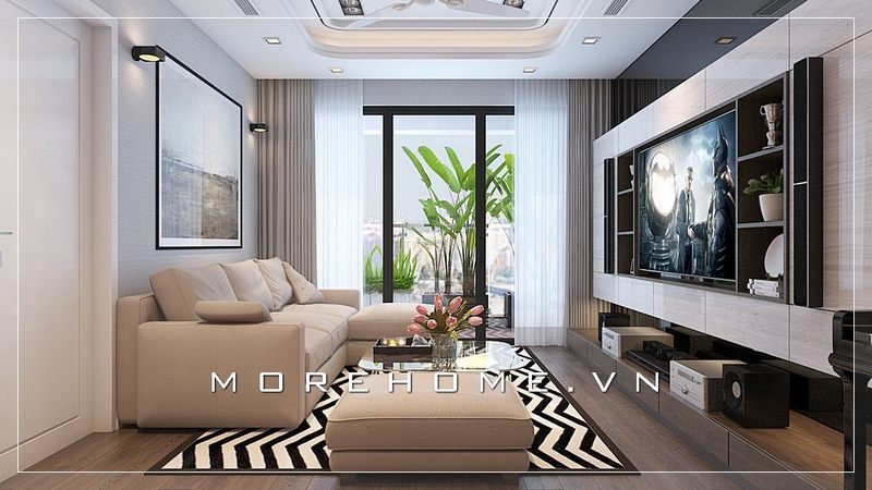 Phong cách đương đại đẹp, sang trọng với tone màu trắng sữa nhã nhặn tạo góc nhìn thanh lịch cho phòng khách căn hộ chung cư.