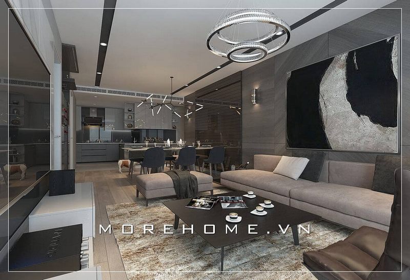 Với xu hướng thiết kế phòng khách liền phòng bếp ăn phong cách hiện đại và kết hợp khéo léo của tone màu ghi} tạo nên không gian hài hòa, thông thoáng cho căn hộ chung cư hiện đại.