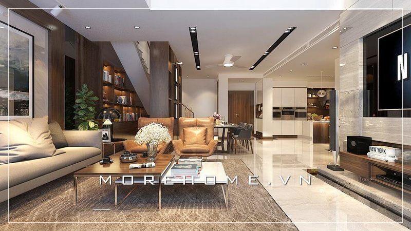 Bố trí nội thất phòng khách liền phòng ăn hiện đại, đẹp, sang trọng cho căn hộ thông tầng như chung cư duplex, penthouse.