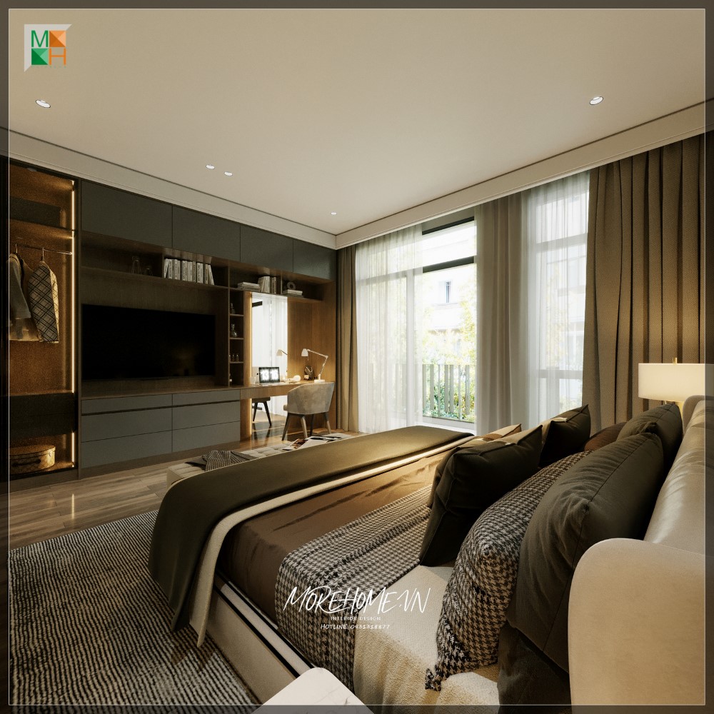 cho người sử dụng Phòng ngủ chung cư hiện đại được trang bị với vật liệu gỗ công nghiệp đẹp trên diện tích nhỏ, được bố trí khoa học với kệ ti vi treo tường và bàn làm việc tích hợp giúp tạo sự tiện nghi cho người sử dụng.